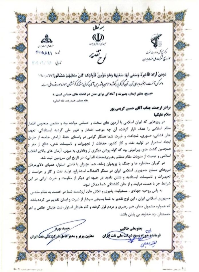 در روزهایی که ایران اسلامی با آزمونهای سخت و حساس مواجه بود و دشمن منحوس اقتدار نظام اسلامی را هدف قرار گرفت، آن چه موجب افتخار و غرور ملی گردید ایستادگی، تعهد، جانفشانی، صبوری، شجاعت و غیرت شما همکار گرامی در راستای حفظ آرامش جامعه از طریق ایجاد استمرار در تولید نفت و گاز کشور، حفاظت از تجهیزات و تأسیسات نفتی، دفاع از مقر و همچنین گشتهای پیرامونی بود که گواه روشن دیگری بر وفاداری به میهن، آرمانهای والای انقلاب اسلامی و تبعیت از منویات مقام معظم رهبری (مدّظلهالعالی) در تاریخ این سرزمین ثبت شد.