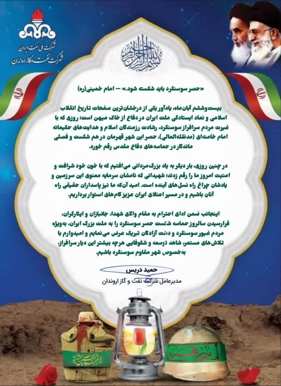 به گزارش روابط عمومی شرکت نفت و گاز اروندان، حمید دریس مدیرعامل این شرکت در پیامی سالروز شکست حصر سوسنگرد را گراميداشت، متن پیام به شرح زیر است: